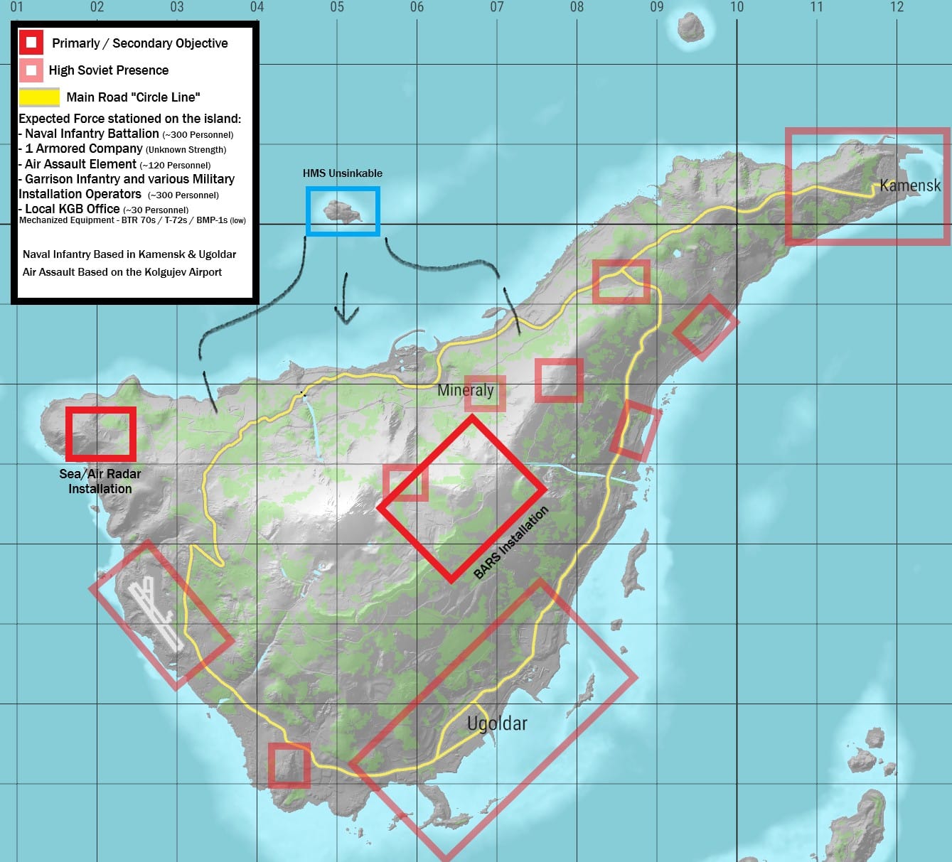 Situation: Soviet electronic surveillance operations on the strategic island of Kolguyev threaten missions in the region. The BARS system provides contact with the Soviet mainland, informing about our naval movements. Intelligence indicates the island is defended by a basic conscripts and a Naval Infantry Battalion with and Air Assault Element supported by an armoured tank company.
